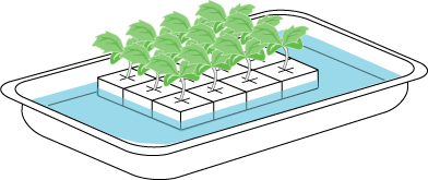 9. เมื่อครบ 7 วัน หลังจากเพาะเมล็ด ต้นกล้าเริ่มมีใบจริง งอกออกมาให้เทน้ำเก่าในถาดอนุบาลออกให้หมด แล้วนำน้ำผสมธาตุอาหาร A, B แบบเจือจาง เติมลงไปในถาดแทนน้ำเดิม และลดระดับน้ำให้เหลือ 1/3 ของก้อนฟองน้ำ และเพิ่มระยะเวลาในการรับแสงแดดของต้นกล้า 5 – 6 ชั่วโมง/วัน การเพิ่มปริมาณแสงแดดให้ต้นเกล้าจะทำให้ต้นเกล้าแข็งแรงและเคยชินกับแสงแดดทำให้เวลาย้ายลงปลูกผักจะไม่มีอาการเฉี่ยวเฉาได้ง่ายเมื่อถูกแสงแดดแรงๆ
