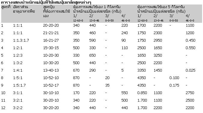 1. ปุ๋ยพืชที่มีสูตรสูง อย่างน้อยควรมีผสมรวมของN+P2O3+K2O ไม่น้อยกว่า 30 เปอร์เซ็นต์ สำหรับปุ๋ยน้ำและ 60 เปอร์เซ็นต์ สำหรับปุ๋ยเกล็ด